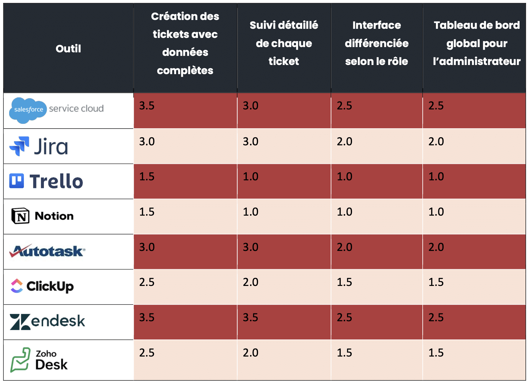 L’objectif n’était pas de reproduire les applications existantes, mais plutôt de comprendre ce qui fonctionne et ne fonctionne pas, et surtout de proposer une alternative plus ciblée et mieux adaptée au contexte spécifique de l’agence Les Artisans Numériques. Le benchmark ci-dessous nous a permis d’avoir une analyse critique de plusieurs outils reconnus comme Salesforce, Jira, Trello, Notion, Autotask, ClickUp, Zendesk et Zoho, en les évaluant spécifiquement à travers le prisme de la gestion opérationnelle des tickets de maintenance. Cette analyse nous a permis de poser des bases solides pour les choix de conception de notre propre plateforme, à propos de l’interface, des fonctionnalités et de la fluidité générale de l’expérience.