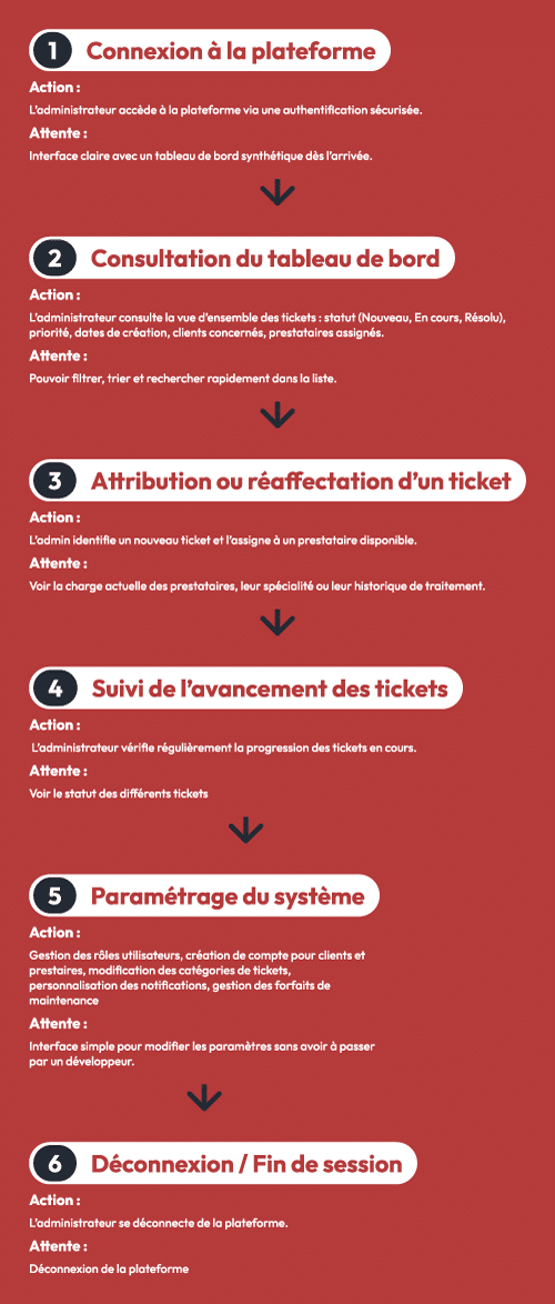 Cette plateforme a pour objectif de faciliter la gestion de la maintenance entre trois types d’utilisateurs bien définis : les clients qui créent des tickets (demandes) de maintenance, les partenaires prestataires de l’agence qui participent à la résolution des problèmes mentionnés dans les tickets des clients, et enfin les administrateurs qui supervisent l’avancement et la résolution de ces tickets, en l’occurrence les responsables de l’agence.