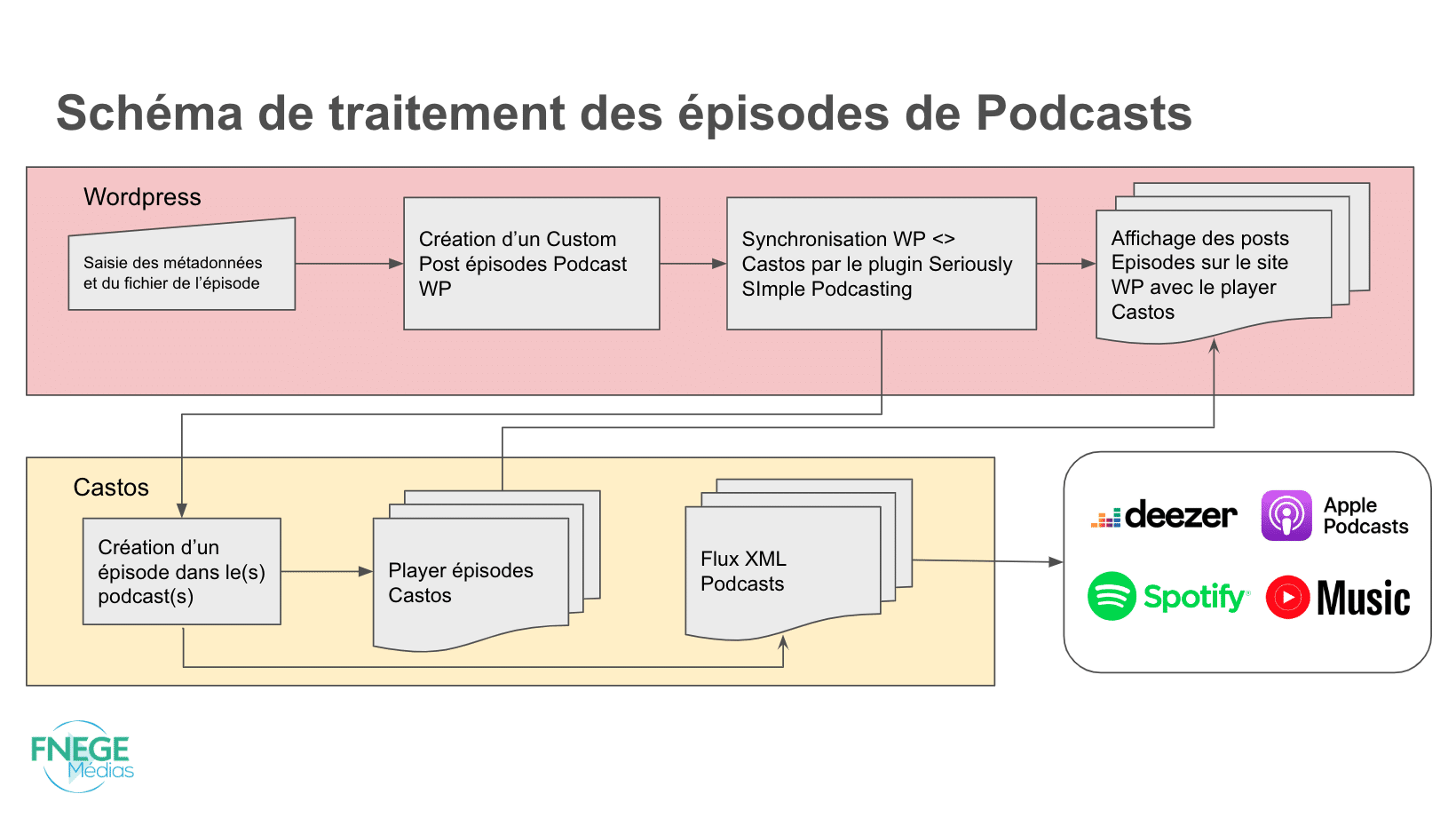 L’administrateur WordPress crée les épisodes comme un post WordPress. Il uploade le fichier MP3 et saisit les métadonnées grâce à l’interface WordPress. Lorsqu’il publie le post, l’épisode est créé sur Castos, publié sur le site fnege-medias.fr et envoyé aux plateformes grâce à un flux RSS unique généré par Castos. Grâce à cette interface centralisée d’administration des épisodes, les podcasts sont toujours à jour, quel que soit le canal de diffusion.