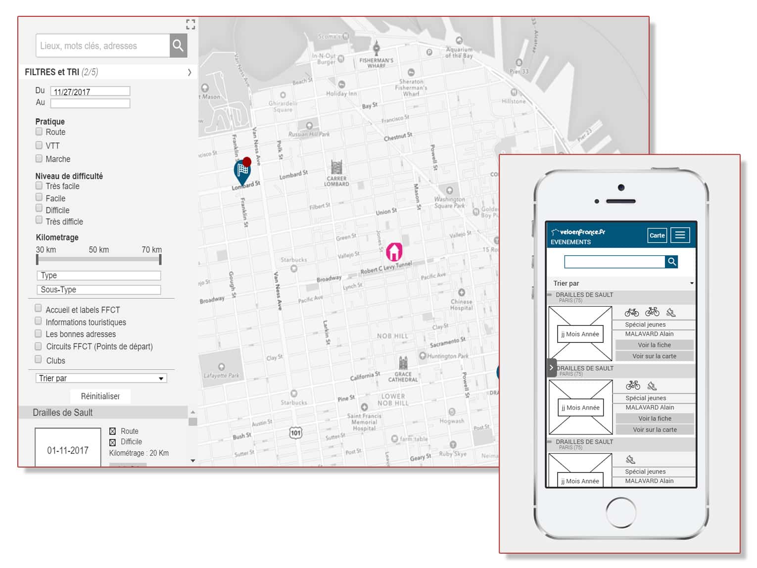 Dès le commencement du projet, tous les intervenants se sont rejoints sur une évidence : le succès de l’opération allait dépendre principalement de l’UX design. Nous avons donc accordé une importance particulière à cette phase de la refonte. Il s’agissait notamment de permettre à l’utilisateur de naviguer facilement d’un type de point d’intérêt à un autre (clubs, événements …), de pouvoir basculer simplement d’un mode d’affichage à un autre (mode carte / mode liste), de pouvoir afficher toutes les informations d’un point d’intérêt sans quitter la carte, de manière à permettre la reprise de la navigation de manière fluide. Il a aussi fallu faire en sorte que l’expérience soit cohérente sur tous les types d’écrans. Pour répondre à tous ces besoins, nous avons imaginé et matérialisé notre concept grâce à un prototype interactif, qui a permis de la valider l’expérience utilisateur en amont du développement.